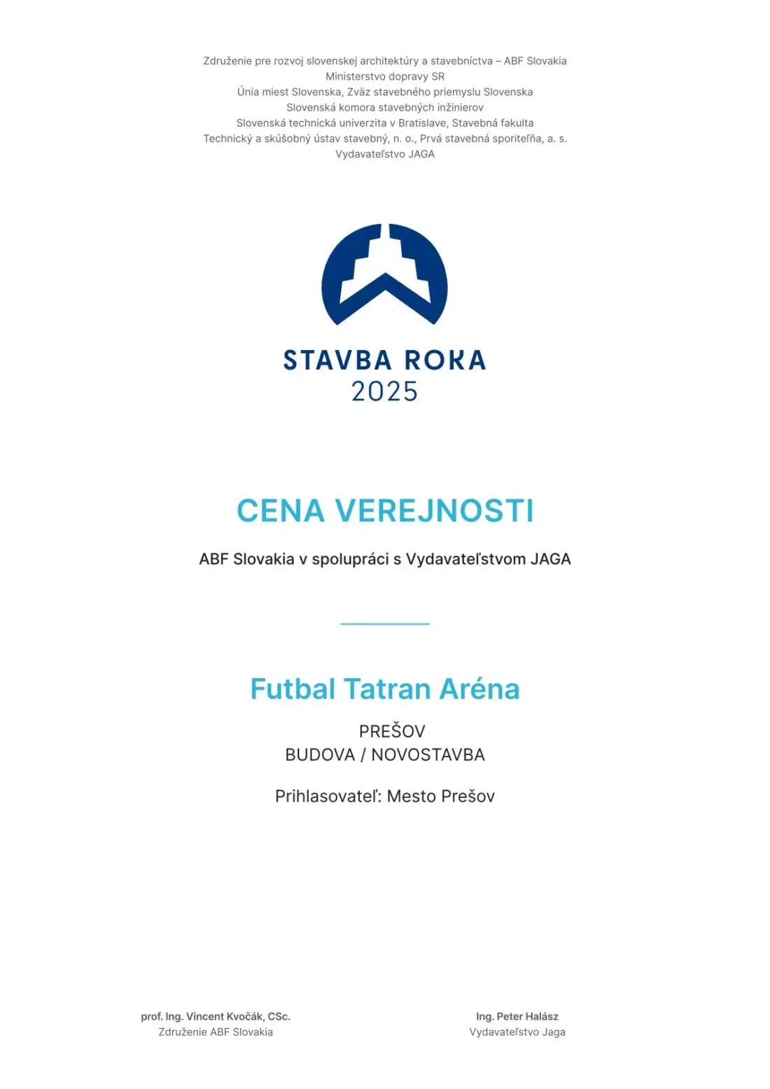 Projekt Futbal Tatran Aréna v Prešove získal v prestížnej celoštátnej súťaži Stavba roka 2025 významné ocenenie – Cenu verejnosti.